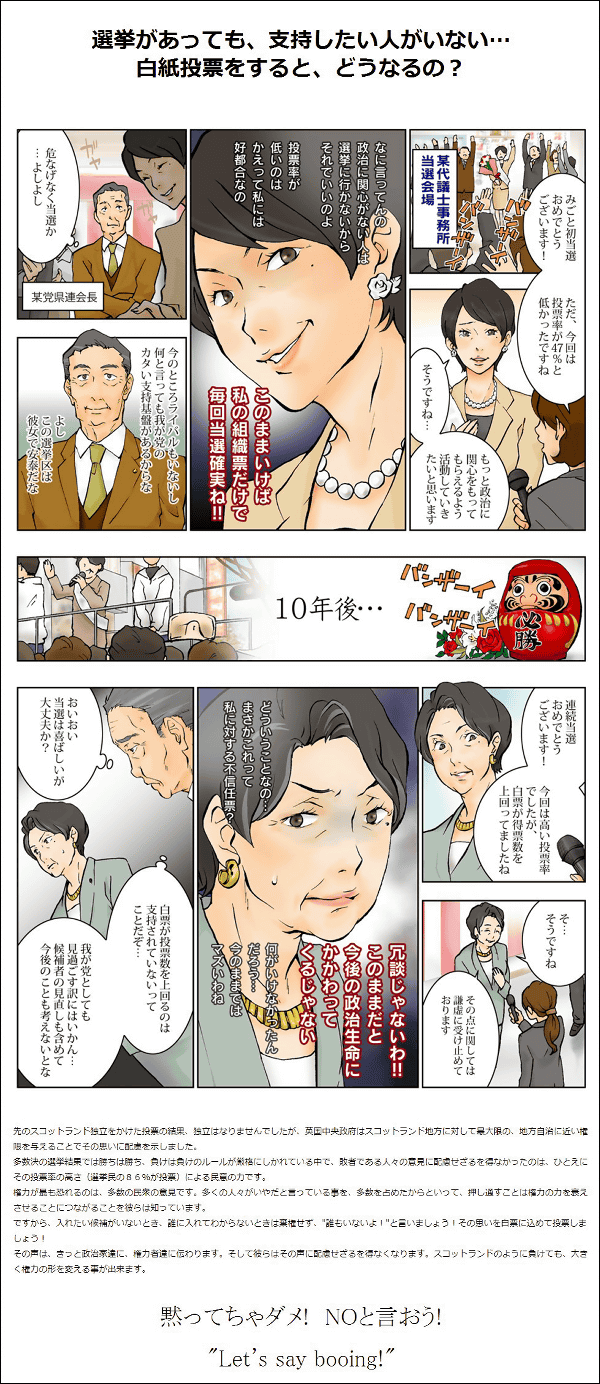 投票したい候補がいないという気持を白票で表現するという、日本独自の民主主義文化を創り上げていけたらと思っています。