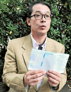 写真=給与明細を手に、非正規雇用ばかりを増やすアベノミクスの問題点について話す猪井さん=逗子市で